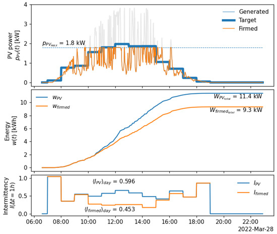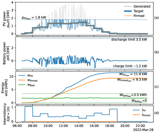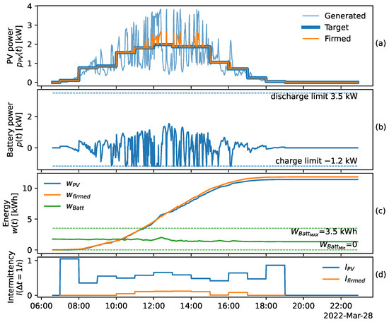 Simulated firming of renewables using real solar data without power limits: (a) PV generation with significant intermittency; (b) battery power and its limits; (c) battery energy and generated energy; (d) intermittency.