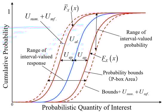 In Figure 6, the blue line denotes the CDF of QoI obtained by transferring uncertainty through the model with only random uncertainty. Based on a single CDF, the epistemic uncertainty is gradually included to obtain a set of CDFs, and the red line represents probability bounds from the CDFs. Moreover, model formal uncertainty and numerical uncertainty are introduced to the probability bounds, such that the p-box is expanded. The generated p-box diagram indicates that a given probability or response level can derive the corresponding interval-valued response range or interval-valued probability range, respectively [].