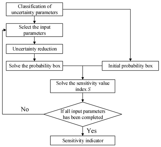 Sensitivity analysis is to study the effect of system input uncertainty on the output response. There are two basic reasons for system sensitivity analysis: one is to understand how the conclusions and inferences obtained from the evaluation depend on its input conditions; the other is to improve the input conditions. Estimate and then maximize the reliability of the system []. Given the significance of sensitivity analysis in interpreting calculated results, many analytical disciplines attach great importance to this approach. However, in practical engineering applications, because the precise distribution is unknown, interval values are generally used for uncertainty prediction, and the conventional sensitivity analysis method fails due to the imprecise form of input variables []. Ferson [] proposes a p-box to characterize this type of uncertainty by using a pinching method to evaluate the hypothetical impact of additional empirical knowledge on output uncertainty.