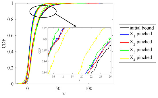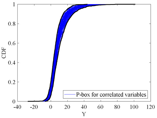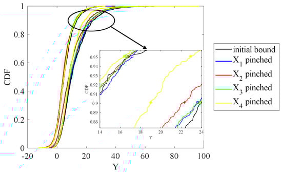 The original problem can then be equated to a hybrid aleatory and epistemic uncertainty problem with mutually independent variables, and a p-box sensitivity analysis is conducted on the transformed independent variables using the pinching method. As depicted in Figure 11, based on the hybrid aleatory and epistemic uncertainty characterized by the p-box, forward uncertainty propagation is performed to obtain the p-box corresponding to the response Y. The uncertainty reduction is performed sequentially for the input parameters X1~X4 to determine the corresponding reduced p-boxes (Figure 12). Likewise, the improved Equation (23) is used to calculate the sensitivity index values S for the respective input parameter, and the results are listed in Table 2. As depicted in the table, the sensitivity indexes obtained in the case of considering correlation are not consistent with those in the case of not considering correlation, indicating that the correlation between variables sometimes affects the sensitivity analysis, which may cause greater uncertainty analysis errors if the correlated variables are assumed as independent variables for analysis.