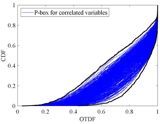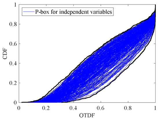 The specific mathematical expression of the p-box is , where denotes the probability distribution function space in the real domain ℜ, , , : . and are the upper and lower probability boundaries of the p-box, respectively, and the region enclosed by the upper and lower boundaries can be expressed by the area according to Equation (21).