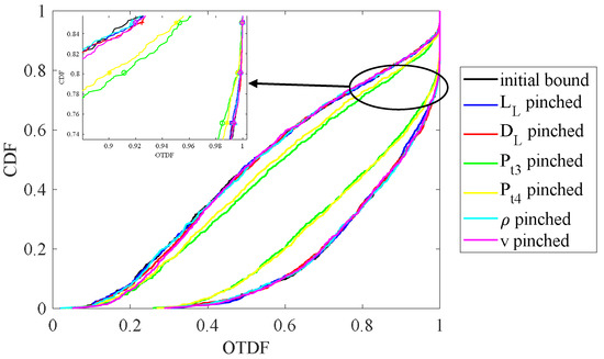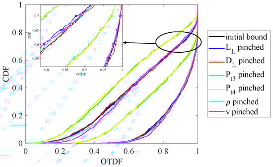 First, the p-box uncertainty analysis of OTDF is conducted by considering the case of correlation between variables. As depicted in Figure 14, the 1000 CDFs of OTDF are taken to form the p-box under the initial conditions. As depicted in Figure 15, using the pinching method to reduce the uncertainty of the respective input parameters 1~6, a specific probability distribution is selected to eliminate the epistemic uncertainty and retain the aleatory uncertainty, and the p-box after the corresponding reduction of uncertainty is determined. Equation (23) expresses the mean value S of the sensitivity indexes, and the calculation results are listed in Table 4. As depicted in Table 4, the ranking of sensitivity is Pt3 > Pt4 > v > ρ > DL > LL. For the performance parameter OTDF, the inlet condition has the most significant effect, and the geometrical parameter exerts a smaller effect.