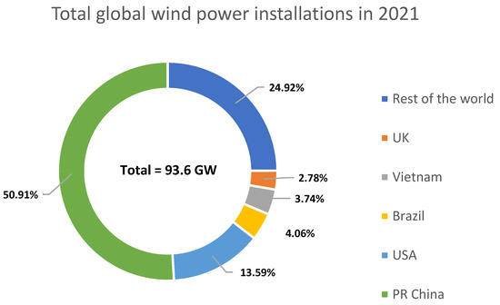 The cumulative global installed capacity of wind energy is about 93.6 GW of the additional wind generating capacity installed globally in 2021, as shown in Figure 1.