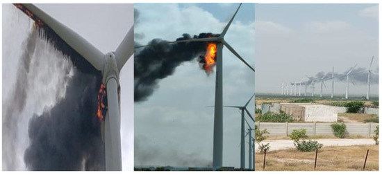 The generator of a wind turbine is one of the most failure-prone assemblies due to the variable loads [8]. Continuous operations in all environmental conditions contribute to failures of wind turbine components, assemblies, and systems. Bearing failures account for more than 40% of the overall wind turbine generator failures leading to unexpected energy losses [9]. In Figure 3, a fire in a wind turbine is represented. According to [10], the turbine may have failed because of the generator’s high bearing temperature due to a shutdown that led the generator to set on fire. The high temperature, combined with the leakage of oil from the rotating manifold nearby, probably triggered the fire.
