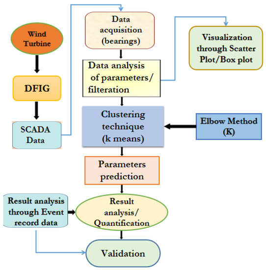 The rest of the paper is structured as follows: Section 2 presents the research methodology describing the data-based approach and reporting the research flow of the study. Section 3 provides the results and analysis of the study. Techniques and methods (K-means clustering approach, elbow method, boxplot visualization) are discussed and applied to the SCADA data where faults are known to have occurred, and conclusions and future recommendations are drawn.