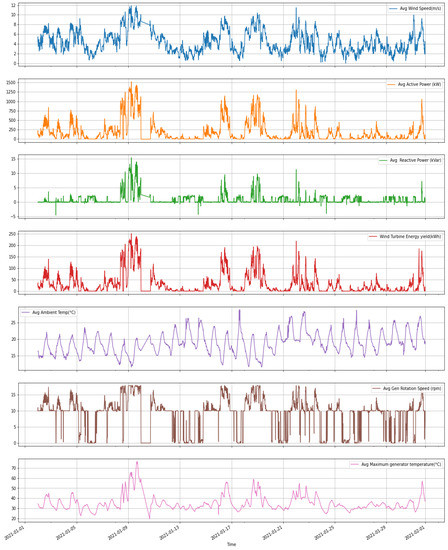 In order to analyze the trend and cycles, studies of the parameters with regard to time were devised, as shown in Figure 7. Based on the number of notices and downtime hours, Figure 6 displays the monthly report of the evaluation indices for a certain DFIG. One-month duration is displayed on the x-axis, and the left y-axis displays the ranges and downtime hours. The two temperature parameters exhibit nonlinear and progressive variation tendencies, and the wind speed varies significantly.