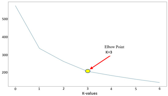 The elbow method is an effective method for cluster optimization and is used for clustering analysis since it is simple to implement and yields useful results. The elbow technique is a visual way to verify the consistency of the optimal number of clusters by analyzing the difference in the sum of square errors (SSE) of each cluster. The most severe difference creating the angle of the elbow indicates the optimum cluster number [27].
