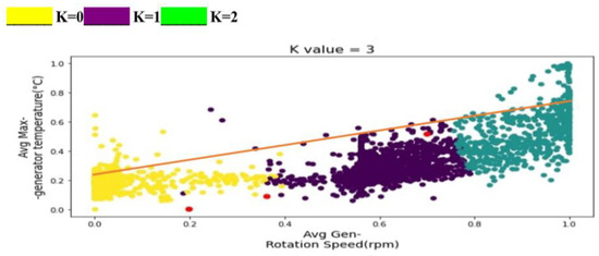 The clusters are more clearly defined and confined the closer together these distances are by adjusting the k-value to 3 and observing the clusters again with respect to all parameters. The grouping of data points does not give a good correlation between all parameters except the average generator temperature and the average generator rotation speed, which are clearly grouped in Figure 9. However, a linear relationship (orange line) can be observed between the temperature and the rotation speed of the DFIG bearings.