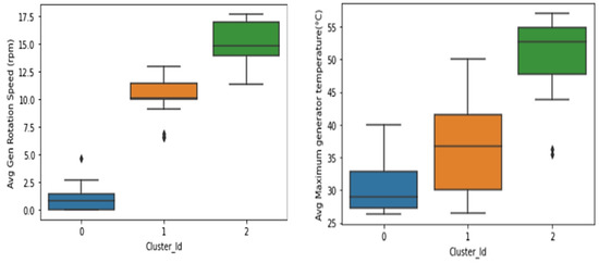 The relationship function between the assessment indices and their influencing factors was established using a boxplot. The condition assessment index of DFIG bearings was generated using a boxplot representation of k-means clustering algorithms. The boxplot visualization of the k-means cluster analysis groups individuals as average maximum generator temperature (°C) and average gen rotation speed (rpm).