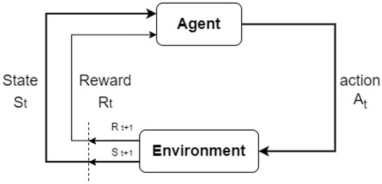 Figure 1 illustrates the MDP where a decision maker called the agent interacts with its environment sequentially. At each time step, given the state of the environment , the agent selects an action . The environment is then transitioned into its new state and the agent is given an immediate reward as its consequent action. The state–action pair can be continuous or discrete.