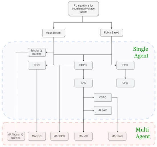 A taxonomy and categories of the most popular RL algorithms are provided in [78], and RL algorithms are divided into two main categories: model-based and model-free. The model-based RL methods require or learn the model of the environment and the model-free methods do not model the environment but look for the optimal policy directly. RL algorithms used for coordinated voltage control in most studies are model-free. The reason is the difficulty of guaranteeing a good model of the environment, which is the electricity distribution network, due to the uncertainties in its network topology, DERs and loads. Model-free RL algorithms can be further categorized into value-based and policy-based. Value-based RL algorithms such as Q-learning derive the optimal policy by determining the optimal action-value function , and policy-based RL algorithms optimize the policy directly. A classification of the most commonly used types of RL algorithms for coordinated voltage control is given in Figure 2.