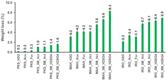 After pretreatment of the three biomasses, the percentage of material loss varied from 0.2 ± 0.0% to 1.6 ± 0.1% for PKS, 3.2 ± 0.8% to 8.3 ± 0.3% for MAH sawdust and 2.2 ± 0.6% to 6.9 ± 0.0% for the IRO sawdust. Less material loss was observed for the PKS compared to the IRO and MAH sawdust. This may be due to the complexity and robust structure as well as the recalcitrant nature of the lignin-rich PKS to acid degradation [40,41]. The differences in material loss observed for PKS, MAH and IRO may be attributed to the structure and composition of these biomasses and not the leaching method used [1]. In comparison with the woody biomasses (MAH and IRO), PKS has also been shown to have a higher density (1.19–1.32 g/cm3) [42] than MAH and IRO (0.52 and 0.61 g/cm3, respectively) [43]. As observed in Figure 1, more material loss occurs with increasing severity of the acid pretreatment for all three biomass samples. Pretreatment with water and mild acid (5 M of acetic acid and formic acid) resulted in less material loss compared to pretreatment with the strong acids (3 and 5 M of HCl and H2SO4), where the highest loss of 6.9% and 8.3% was found for the 5 M H2SO4 pretreatment of IRO and MAH sawdust, respectively. This could be attributed to the harshness of the acid solution and, also, because more fines were generated for the biomass samples, which led to higher material loss after washing with Milli-Q water. This result is similar to a previous study where the loss of fines was lesser for PKS leached with distilled water compared to that pretreated with 5% dilute acetic acid [44].