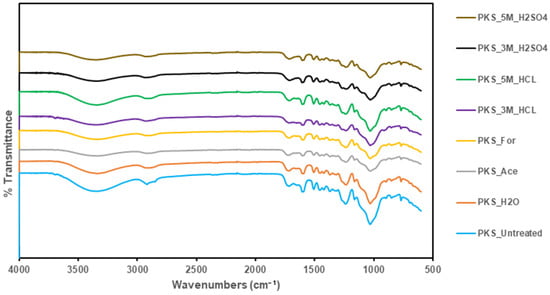 FTIR analysis for the raw and pretreated PKS, MAH and IRO was carried out to investigate the impact of the pretreatment on the chemical structures of the biomass. The FTIR spectra presented in Figure 2 show that the acid-washed PKS was slightly affected by the acid pretreatment compared to that of the untreated PKS. The deviation was most notable at the absorption band of 1000 cm−1 for the PKS treated with H2SO4, acetic and formic acid, which corresponds to the C-O stretching of polysaccharides. However, only small differences were observed for the woody biomasses (MAH and IRO) for all the leaching treatment, as shown by the FTIR spectra in Figure S1. The slight deviations in the peak intensities are mostly observed for the peak bands between 3600–3200, 3000–2800, 1800–1200, and 1100–800 cm−1 for the PKS, MAH and IRO. However, the deviations were stronger for the woody biomass (MAH and IRO) and especially in the region of 1800–1200 cm−1. Furthermore, the deviations in the peak intensities could mean that some functional groups in the biomass were disrupted to a certain extent after acid pretreatment [7]. The broad band at 3600–3200 cm−1 corresponds to the O-H stretching vibration of phenolic, alcoholic and carboxylic functional groups [48]. The reduced intensity observed at 3326 cm−1, especially for the strong-acid-pretreated woody biomass, can be attributed to the disruption of hydrogen bonds of cellulose in the sample after acid pretreatment [7,49]. The deviation at 2922 cm−1 corresponds to C-H stretching vibrations of -CH2 and -CH3 functional groups and is interpreted as cellulose being present in the biomass [48,50]. The disruption of this band could be due to changes in the cellulose crystallinity [51]. The absorption band at 1713 cm−1 and 1735 cm−1 corresponds to the hemicellulose content [48]. The reduction in the peak intensity, especially for the woody biomass, can be attributed to the hydrolysis of hemicellulose during pretreatment [52]. Additionally, the bands at 1601, 1509 and 1455 cm−1 are due to the C=C stretching vibrations and correspond to the presence of lignin. The reduction in peak intensity after acid washing of the different biomasses can be attributed to condensation reactions and/or splitting of lignin aliphatic side chains [7]. The absorption band at 1370–1235 cm−1 indicates the presence of alkanes and is due to the C–H stretching vibration of cellulose [53,54]. The strong absorption band at 1031 cm−1 corresponds to the C-O stretching of polysaccharides [7]; for this study, there was no deviation in peak intensity for any of the three biomasses investigated. Finally, the band at 897 cm−1 is associated with the C-O-C bond from the cellulose, and its enhancement can be attributed to an increase in the relative content of cellulose due to the release of the hemicellulose fraction during pretreatment [55].