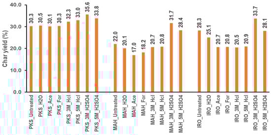 Figure 3 shows the char yield from the thermogravimetric analysis for untreated and pretreated PKS, MAH and IRO. The char yield obtained at 600 °C describes the degradation behaviour of the raw and pretreated biomasses. As observed, the char yield from the PKS residue showed higher char yield than the untreated PKS for the demineralised biomass when compared to those of MAH and IRO. This is because demineralisation increases devolatilisation and the initial decomposition temperature of the biomass pyrolysis, which can be attributed to the high potassium and lignin content of PKS [3,56]. Additionally, potassium, which is one of the main inorganic constituents in PKS (150 mg/kg), has been reported to be a strong catalyst for char gasification [3,56]. The char yield for the PKS was almost equal for the untreated, water and mild acid treatment and with a slight increase in the char yield from 30.3 wt.% of the untreated PKS to 33.0 and 35.6 wt.% for PKS treated with 5 M HCl and 3 M H2SO4, respectively, which may be due to the slow degradation and thermal stability of the lignin molecule [14]. This trend was, however, different for the woody biomasses (MAH and IRO). They showed an initial decrease in char yield compared to the untreated sample when using mild acids and then an elevated char yield for the H2SO4 pretreated samples. The result is in agreement with previous studies [57,58], even though other species were used: Pinus radiata wood chips [58] and Douglas fir and hybrid poplar wood [57]. The increased char yield can be attributed to the increased presence of sulphur in the biomass after leaching with H2SO4, which shows that some sulphur remained in the biomass after washing with water. This may have catalysed the char formation by polymerisation of the primary vapours [58].