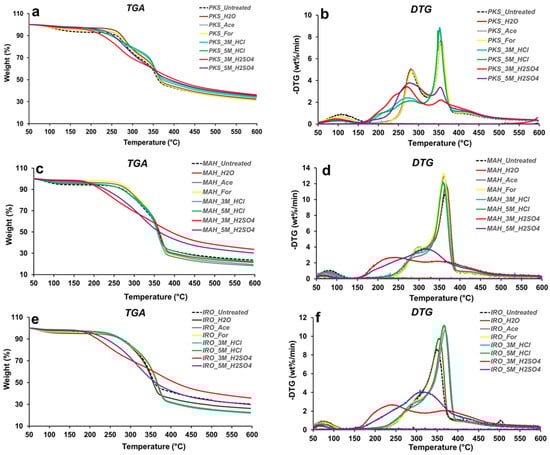 Thermogravimetric analysis (TGA) and differential thermogravimetic (DTG) curves of raw and pretreated PKS (a,b), MAH (c,d) and IRO (e,f).