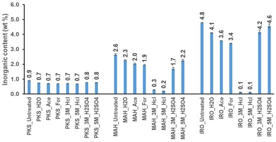 The amount of inorganic materials can influence thermal degradation and chemical reaction pathways during pyrolysis [8]. The removal of inorganic material slightly reduces the formation of crosslinks between the biomass polymers [58]. In this work, the removal of inorganic material from the raw PKS by washing/leaching was very low, an indication of lower ash content in the PKS compared to the MAH and IRO, as shown also in Table 2. As observed from Figure 5, the untreated PKS, MAH and IRO had the highest amount of inorganic substances, while MAH and IRO pretreated with 3 and 5 M HCl gave the lowest amount of inorganic material, with about 90% and 98% removal efficiency for MAH and IRO, respectively. This shows that HCl was highly effective in removing inorganic substances present in the biomass, which may be as a result of the biomass structure being opened up by the acid [1]. However, the result was different for PKS, with only about 24% removal of inorganic materials after leaching with HCl. This may be due to the stability and high lignin content of the PKS compared to that of the woody biomass [48]. The degree to which lignin is present in a biomass sample can influence its digestibility [63,64]. This is because lignin is closely bound to cellulose microfibrils, which prevents enzyme accessibility [63]. The high removal of inorganic substances by HCl in the woody biomasses (MAH and IRO) is similar to the result presented by Ma et al. [25]. They observed over 90% removal of AAEMs for rice husk pretreated with 0.5 to 4 M solution of HCl.