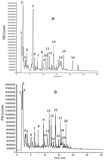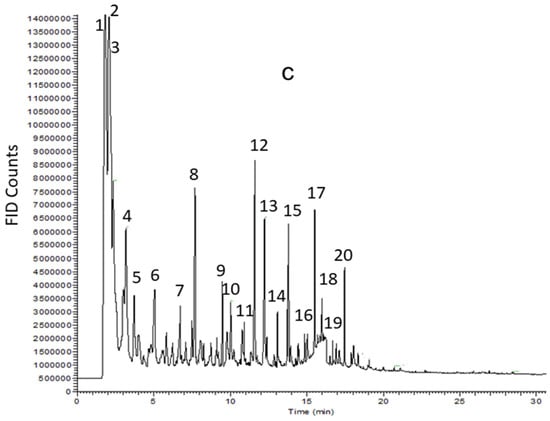(a) Chromatogram of untreated PKS pyrolysis at 600 °C at 5 s. The main components of the untreated PKS pyrolysis: (1) acetaldehyde; (2) acetic acid; (3) 2,3-pentanedione; (4) furfural; (5) phenol; (6) 4-hydroxy-5,6-dihydro-2H-pyran-2-one; (7) 2-methoxyphenol; (8) 4-methyl-2-methoxyphenol; (9) 1,2-benzenediol; (10) 4-ethyl-2-methoxyphenol; (11) 4-vinyl-2-methoxyphenol; (12) 4-(1-propenyl)-2-methoxyphenol; (13) 4-methoxy-3-(methoxymethyl)phenol; (14) 4-acetoxybenzoic acid; (15) 4-(2-propenyl)-2,6-dimethoxyphenol; (16) oleic acid. (b,c) Chromatogram of untreated MAH (b) and IRO (c) pyrolysis at 600 °C at 5 s. The main components of the untreated MAH and IRO pyrolysis: (1) acetaldehyde; (2) hydroxyacetaldehyde (3) acetic acid; (4) 2,3-pentanedione; (5) furfural; (6) 2-methylcyclopentanone; (7) 4-hydroxy-5,6-dihydro-2H-pyran-2-one; (8) 2-methoxyphenol; (9) 4-methyl-2-methoxyphenol; (10) 3-methoxy-1,2-benzenediol; (11) 4-ethyl-2-methoxyphenol; (12) 4-vinyl-2-methoxyphenol; (13) 2,6-dimethoxyphenol (14) 4-(1-propenyl)-2-methoxyphenol; (15) 4-methoxy-3-(methoxymethyl)phenol; (16) 5-tert-butylpyrogallol; (17) 3-tert-butyl-4-hydroxyanisole; (18) levoglucosan; (19) 4-(2-propenyl)-2,6-dimethoxyphenol; (20) 4-(2-propenyl)-2,6-dimethoxyphenol-trans.