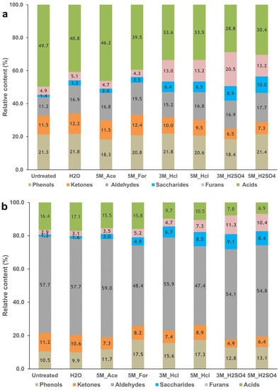 Additionally, the reduction in the relative content observed for the acids for all three biomasses can be attributed to the decreased composition of the hemicellulose content after pretreatment [76], as seen in Table 1.