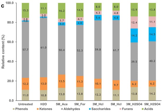 Acetic acid, which is formed mainly by ring opening and cracking reactions, is promoted in the presence of alkali metals [61]. Figure 7a–c show that the relative content of acid for PKS and the woody biomasses decreased for all pretreatment conditions and was more pronounced for the strong acids, especially the H2SO4 pretreatment. This is in agreement with Zhou et al. [57], who observed a lower yield of acetic acid after leaching Douglas fir with H2SO4. The acid decreased from 50 to 30% for PKS, 16 to 8% for MAH and 15 to 14% for IRO pretreated with 3 M H2SO4. This decrease is important for improving the quality and stability of the bio-oil. The high content of acetic acid in the untreated biomass suggests that the compounds have been catalysed by the presence of inorganics [57]. Tables S1–S3 show that the acids are mainly composed of aliphatic acetic acids, together with other aromatic acids, such as 4-hydroxybenzoic acid, 4-acetoxybenzoic acid and oleic acid for the PKS, while those of the woody biomasses are only composed of aliphatic acetic acids.