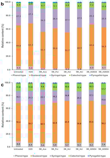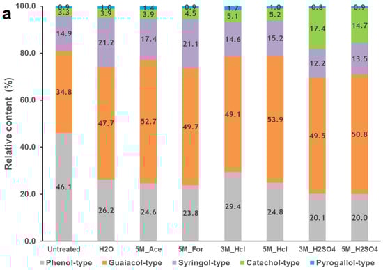 However, the guaiacol- and catechol-type compounds showed an increase in the relative content of the primary products for both the water- and acid-leached biomass samples. Figure 8a shows that the relative content of the guaiacol-type phenols increased from 35% (untreated PKS) to an average of 50% for the pretreated PKS, while the relative content of catechol-type phenols increased from 3% (untreated PKS) to about 5% for the mild-acid- and HCl-pretreated PKS. Additionally, a significant increase from 3 to 17% was observed for the 3 M H2SO4-pretreated PKS. The syringol-type compounds also showed an increase in the volatile compounds for PKS pretreated with water and mild acid solutions. However, the H2SO4-leached biomass decreased from 15% (untreated PKS) to 13% (5 M H2SO4-pretreated PKS). The increase in the relative content of the guaiacol-, catechol- and syringol-type compounds observed in this study indicates minimal degradation of these units in the lignin and may be attributed to the promotion of decarboxylation or decarbonylation reactions, along with the removal of unsaturated alkyl branch chains [14,69]. Peng et al. [69] observed that the addition of K2CO3 and KOH to commercial alkali lignin and purified lignin from black liquor resulted in the promotion of the methoxy phenol and production of alkyl-phenols. The decreased yield of the syringol-type observed in this study for the H2SO4-pretreated PKS is in line with another study [57]. They observed a reduction in the production of the syringol-type compounds, especially for 2,6-dimethoxy-phenol after washing with H2SO4. This was attributed to the negative influence of potassium on the formation of 2,6-dimethoxy-phenol [7].
