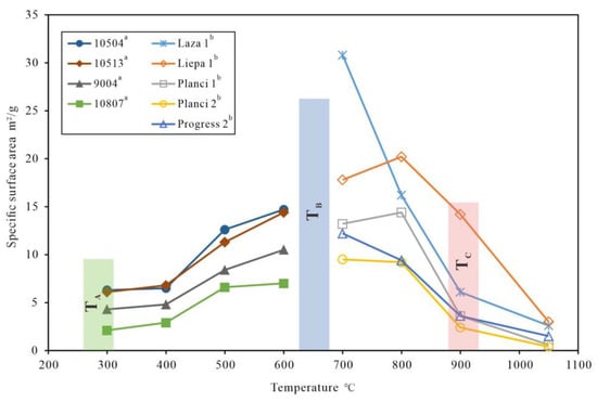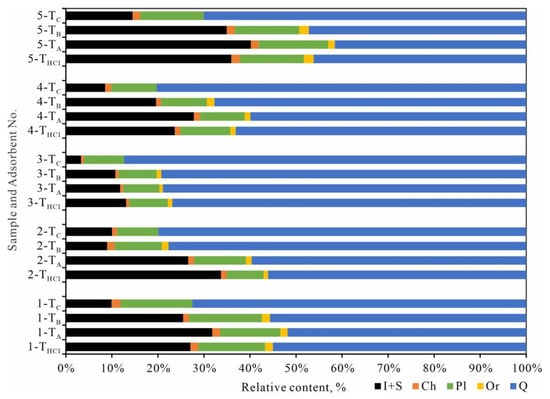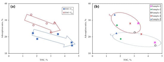 - Under the condition of the adsorbate content being close to the oil content of geological shale samples, the crude oil adsorption capacity of TA (containing kerogen effective carbon) ranged from 1.39 to 3.66 mg/g, and the adsorption ratio ranged from 17.56 to 25.52%. The crude oil adsorption capacity of TB (containing kerogen ineffective carbon) ranged from 1.77 to 4.12 mg/g, and the adsorption ratio ranged from 26.48 to 38.98%. The crude oil adsorption capacity of TC (only inorganic minerals) ranged from 1.18 to 2.40 mg/g, and the adsorption ratio ranged from 11.36 to 17.02%. The change in the surface properties of shale adsorbents during thermal evolution was the main reason for the different crude oil adsorption properties of different types of adsorbent.