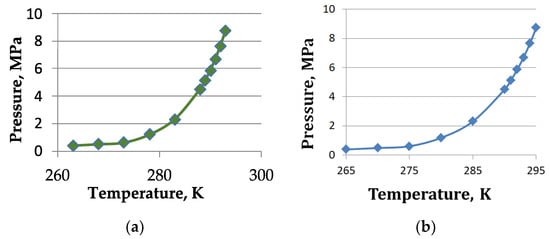 The equilibrium curve: (a) for methane hydrate; (b) for methane-propane hydrate.