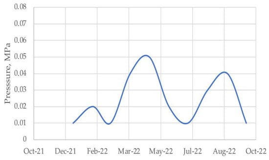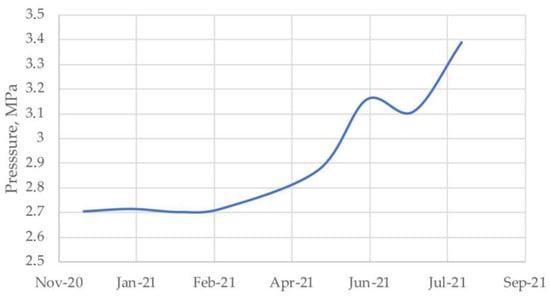 At the exploration well R-49 of the Gubkinskoe gas field, leakage into the intercasing space of the technical case and the conductor was recorded in the intervals of the permafrost area using a wellhead pressure and temperature gauge. Observations showed that, from November 2020 to July 2021, the pressures in the intercasing space continuously increased, which is clearly illustrated in Figure 2.