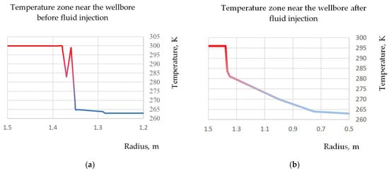 Temperature zone near the wellbore before and after fluid injection: (a)—temperature zone near the wellbore before fluid injection; (b)—temperature zone near the wellbore after fluid injection.