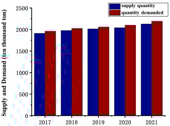 The growing global consumption of fossil fuel energy associated with climate change and environmental concerns has prompted extensive research into developing renewable energy sources to replace the current dependence on limited fossil fuel resources. Promising renewable energy sources, such as solar, wind, tidal, geothermal, biomass, and hydrogen energies, have been developed [1]. Hydrogen is a high-quality fuel. The product of its combustion is water, it can achieve zero-carbon emissions, and it is renewable. Therefore, it is considered a clean and sustainable energy source [2]. Furthermore, hydrogen can be converted into electric energy via fuel cells. As a chemical raw material, it plays a vital role in the industry (production of synthetic ammonia, methanol, and petroleum refining process of hydrogenation reaction). Clear H2 offers large quantity and long-duration green energy storage, and its green derivatives (methanol, and ammonia) avoid expensive long-distance electric grid networks [3]. H2 can also supply stable power demand for aquaculture systems and be used as feedstock for the refinery processes. H2 also has applications in the propulsion systems of ships, submarines, and other vessels [4,5]. Figure 1 shows supply and demand balance in China’s hydrogen industry for the period of 2017–2021; the demand for hydrogen in China has increased annually in this period.