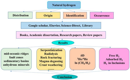Based on keywords, we selected and downloaded articles including those covering the topics of natural hydrogen distribution, the origin of natural hydrogen, the identification of hydrogen, and the occurrence of natural hydrogen. The desk research method was used in this study, which is usually used in scientific research to analyze the available data. Google Scholar, Elsevier, Science-Direct, and library were used to obtain books, academic dissertation, research papers and review papers (Figure 2). For the data cited in the articles, we referred to the earliest citation to ensure the reliability of primary data. The timeliness, professionalism and completeness of the downloaded paper are evaluated.