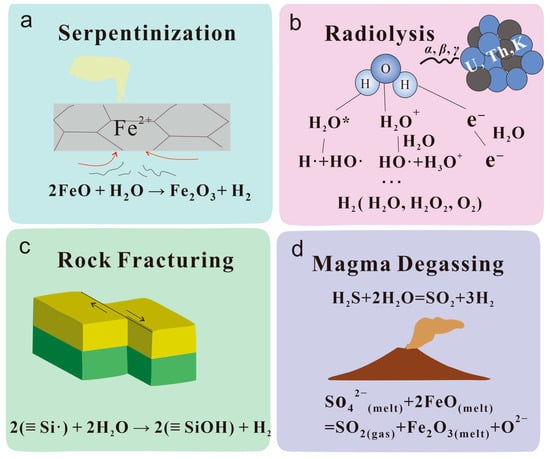 Diagram showing the main sources of hydrogen (modified from [56]). (a) Serpentinization of rocks generates hydrogen if water is reduced during the oxidation of ferrous to ferric iron. (b) Radiolysis produces hydrogen during splitting of water through radioactive decay. (c) Rock fracturing generates hydrogen on the wet surfaces of active faults. (d) Volcanoes emit hydrogen when SO2 is degassed at low pressure.