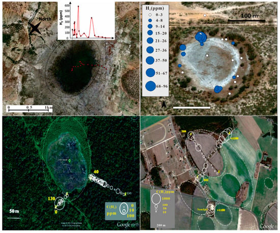 Circular and elliptical depressions (fairy circles) caused by natural hydrogen escaping to the surface (Figure 4) have been located in North Pass Basin, St. Francis Basin, Western Australia, North Carolina, Central Russia, Southern Gironde, US, Brazil, France, and Mali [95,96,97,98,99,100].