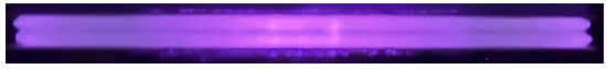 The characteristics of the DBD reactor for removing microplastics based on the applied voltage and frequency were examined because they affect the production of the MPs decomposition factor. Figure 2 shows an image of the discharge when a 15 kV 100 Hz voltage is applied. It is evident that the discharge plasma is actively generated, and ultraviolet rays are also confirmed.