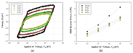 Figure 3a shows the Q − Lissajous curve based on the applied voltage at 100 Hz. As the applied voltage increases, the generated charge and horizontal length—which represent the maximum value of the applied voltage—increase. The DBD reactor power can be calculated using the area of the Q − V Lissajous curve or Equation (1), as follows: