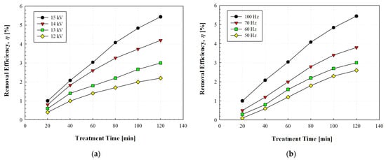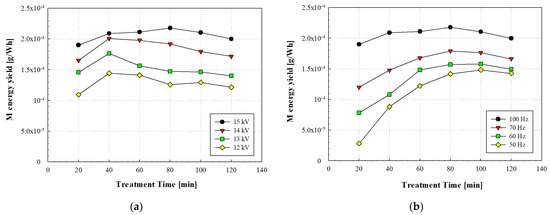Figure 11a shows the M energy yield by treatment time based on the voltage at 100 Hz. As the applied voltage increases, the M energy yield also increases. Additionally, in the case of 15 kV, the M energy yield does not decrease greatly even if the treatment time increases; however, in the 14-, 13-, and 12-kV cases, the value decreases as the treatment time increases. In particular, they show maximum efficiency when treatment is done for approximately 40 min before gradually decreasing. This means that the efficiency decreases as the treatment time increases if the applied voltage is low. When a voltage of 15 kV is applied, the efficiency increases over a relatively long period, exhibiting maximum efficiency at 80 min, showing a tendency to decrease thereafter. Consequently, although the higher the voltage, the higher the power consumption, considering the removal efficiency and M energy yield, it seems desirable to treat the MPs at the highest voltage.