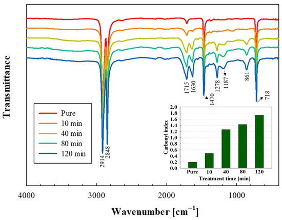 FTIR was used to examine the changes in the functional groups of LDPE over time, the results of which are shown in Figure 5. For pure LDPE, the peak located at 2914 cm−1 arises from the asymmetric stretching of CH2, the peak at 2848 cm−1 arises from the symmetric stretching of CH2, the peak at 1470 cm−1 was bending deformation, and the peak at 718 cm−1 is from the CH2 rocking deformation [33]. Compared with pure LDPE, new peaks after treatment are evident at 1715, 1630, 1278, 1187, and 861 cm−1—that is, peaks corresponding to C=O stretching at 1715 cm−1 and C=C stretching at 1630 cm−1, C-O stretching at 1278 and 1187 cm−1, and C-O-H deformation at 861 cm−1—which could be due to the carbonyl group [23,34,35,36]. Furthermore, it is evident that a slight intensity increase in the -OH stretching region of the hydroxylic group (3050–3570 cm−1) is due to a hydroperoxide and alcohol formation during the DBD plasma treatment [37]. A list of the above contents is summarized and shown in Table 1. The intensities of these peaks continue to increase as the treatment time increases. This result confirms that the LDPE surface is oxidized, and O-containing functional groups are produced by the DBD plasma [25].