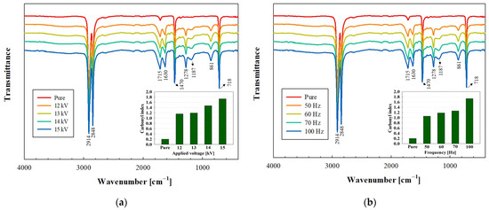Figure 6 shows the FTIR graph and CI based on the electrical conditions. Figure 6a is the FTIR graph of the LDPE treated for 120 min under different voltage conditions at a frequency of 100 Hz. The new peak generated as a result of DBD plasma treatment is similar to that shown in Figure 5. However, the intensity differs slightly, the degree of degradation being confirmed through the CI. As a result of treatment for 120 min at each voltage, the CI is approximately 1.2 when a 12,13-kV voltage is applied. This is considered to be because DBD occurs from a low voltage of approximately 11 kV, but does not occur strongly at 12 and 13 kV. The results also show that the CI increases as the applied voltage are raised to 14 and 15 kV.