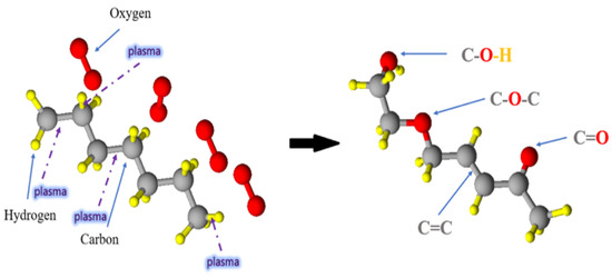 Figure 6b shows the FTIR graph of the LDPE treated for 120 min under different frequency conditions at a voltage of 15 kV. Even when the frequency changes, the new peak is the same, with the intensity of the peak increasing as the frequency increases. The CI results also increase in proportion to the frequency, the increase being similar to the power increase based on the frequency, as shown in Figure 3b. Consequently, through mass changes and FTIR analyses, it is evident that the degree of degradation of LDPE is related to power to some extent. Figure 7 shows how chemical changes occur during plasma treatment, with new peaks arising from the FTIR analysis.