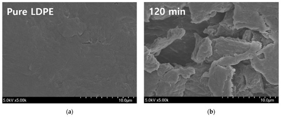 SEM images of LDPE samples at different treatment times (a) pure LDPE (b) 120 min.