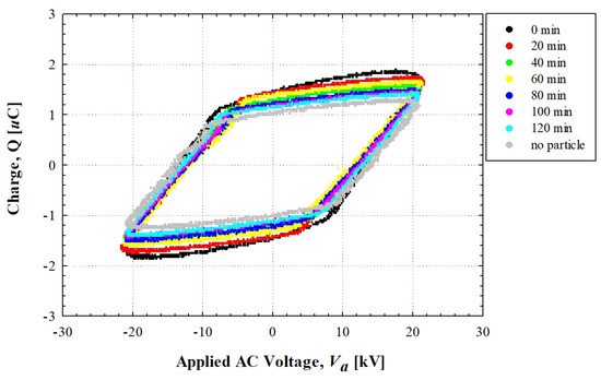 Figure 9 shows a Lissajous curve measured every 20 min by applying a 15-kV 100-Hz voltage after inputting 0.05 g of LDPE. The DBD plasma occurs strongly immediately after particle input, with a maximum charge of up to 1.8 uC. However, as the treatment time increases, the maximum charge gradually decreases and the size of the Lissajous curve gradually decreases. This is considered to be because of changes in the permittivity due to the deterioration of the LDPE particles inside the DBD reactor and changes in particle arrangement—this causes a change in the capacitance of the DBD reactor, which can be confirmed by the fact that the slope of the Lissajous curve becomes gentler, as shown in Figure 9.