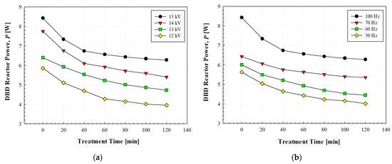 Figure 10 shows the power changes with treatment time. Figure 10a shows the power by treatment time based on the voltage at 100 Hz, as calculated using Equation (1). As shown in Figure 9, the power decreases as the size of the Lissajous curve decreases over time, this feature being the same at all voltages. During the period 0–40 min, which is a relatively short treatment time, the power is rapidly reduced, the amount of reduction thereafter being relatively small. Additionally, the initial decrease is larger at the relatively high voltages of 14 and 15 kV, supporting the suggestion that it is related to the treatment of the inner LDPE particles described above.