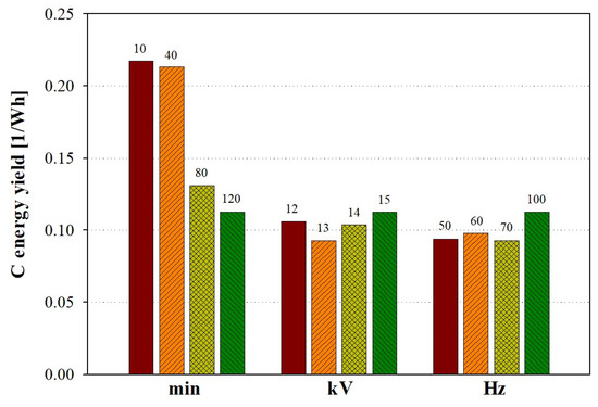 The right group shows the C energy yield when treated under different frequency conditions at 15 kV for 120 min. Applying low-frequency results in low absolute surface throughput and a low C energy yield. The 50-, 60-, and 70-Hz cases all show values of approximately 0.9, there being no significant differences. Consequently, as shown in Figure 12, the higher the voltage and frequency, the better the C energy yield, and the longer the treatment time, the worse the C energy yield.