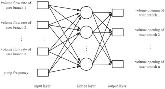 In this paper, a backpropagation (BP) neural network is used to construct the relationship between the volume flow rate of each user branch, pump frequency, and the valve opening of each user branch in a chilled water HVAC system. A BP neural network is the most widely used artificial neural network (ANN), which is a forward network based on error backpropagation and has a very strong nonlinear mapping ability [36]. In general, the BP neural network includes three layers: the input layer, the hidden layer, and the output layer. In this paper, the volume flow rate of each user branch and the pump frequency are set as the input layer of the BP neural network. The valve opening was set as the output layer. The hidden layer of the neural network is set as 1 layer, and the number of neuron nodes can be determined according to an empirical formula. For any chilled water HVAC system containing n branches, the ANN model can be established as shown in Figure 1.