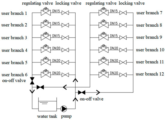 In this paper, an experimental system is built to simulate a chilled water HVAC system, as shown in Figure 3. The experimental system has 12 branches, including 6 DN15 branches and 6 DN20 branches, respectively, simulating 12 air-conditioning users.