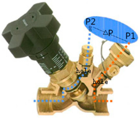 It can be seen in Figure 4 that there are two pressure-measuring holes on the regulating valve. The pressure difference of the regulating valve can be measured through the two measuring holes, using a pressure difference sensor. The volume flow rate of the user branch can be calculated using the pressure difference of the corresponding regulating valve, via Equation (1):