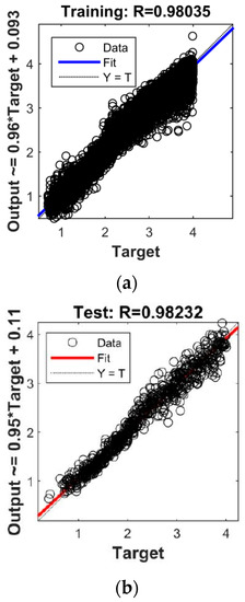 Correlation coefficient of the trained neural network: (a) training set; (b) test set.