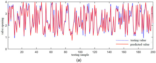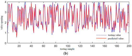 The prediction performance of the ANN model was analyzed by comparing the testing value with the predicted value of the ANN model. The first user branch and the seventh user branch were selected as examples to analyze the deviation between the testing value and the predicted value of the ANN, as shown in Figure 6. It should be noted that there is no unit for the valve opening. It can be seen from Figure 6 that the predicted value of the ANN fitted well with the testing value, and the mean absolute percentage error was about 8.11%. In order to verify the superiority of the neural network, combined with a genetic algorithm, it was compared with the unoptimized BP algorithm in Figure 7. The results showed that the optimized neural network algorithm improved the prediction accuracy by 5.52%, compared with the BP algorithm, which indicates that the trained ANN model could be used to predict the valve opening of each user branch from the volume flow rate of each user branch and pump frequency.