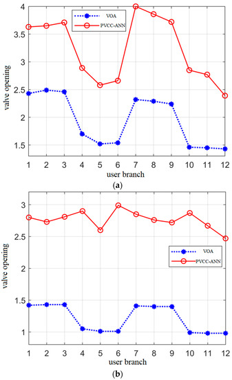 - The required volume flow rate of each user branch and the computational pump frequency are set as the input layer of the trained ANN model, to predict the computational valve opening of each user branch.