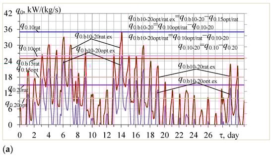 As can be seen, the actual values of available booster refrigeration capacities q0.b10-20opt are lower than the current need q0.15 within 10–13th and later 20th of July, which leads to considerable values of the current deficit q0.b10-20opt.def (Figure 4a). Accordingly, the current deficits q0.b10-20opt.def are comparable with the current exceedance of booster refrigeration capacities q0.b10-20opt.ex that is proven by alternating the rising and falling of the summarized exceedance of booster refrigeration energy values ∑q0.b10-20opt.exτ during July (Figure 4b).