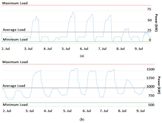 Commercial load profiles modeling warehouse, hospital, and primary school buildings in Kansas City, MO were extracted from REopt’s own database and used for the other two locations to avoid unnecessary variations. The weekly load profile data for the commercial loads are illustrated in Figure 2. The electricity rates used for each location considered in this study are presented in Appendix A. In particular, the electricity rates were collected from the Open Energy Information (OpenEI) database [30] and represent real-world data from utilities within a 50-m radius from the cities listed in the previous section.